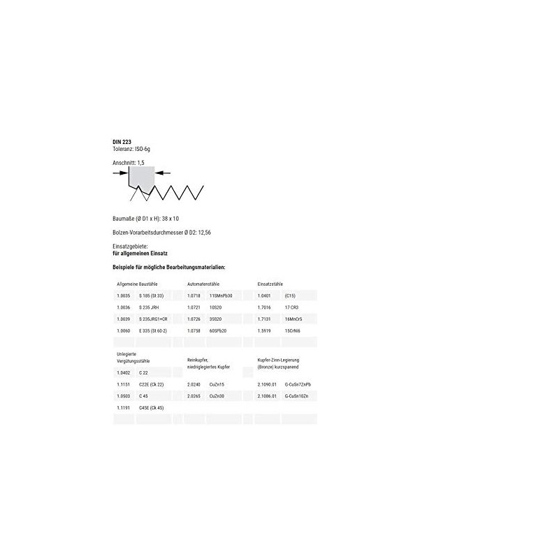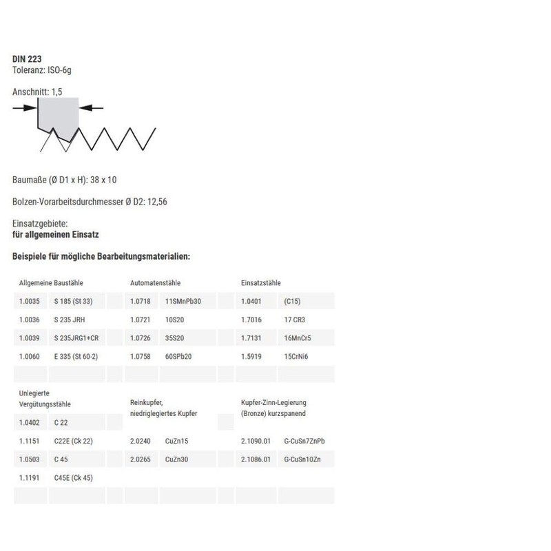 BAER Die UNF 1/2 x 20 – HSS | DIN 223 Tolerance: ISO 6 g Cut: 1.5 Dimensions (diameter D1 x H): 38 x 10 - Bolt prework diameter D2: 12.56 | Areas of application: for general use | External thread with round outer profile can be made with dies. In addition to proven quality, our thread dies impress with a strong price.