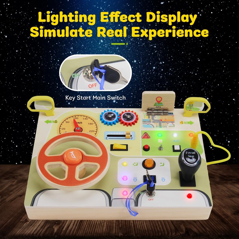 Baeroly Montessori Sensory Toy with Simulated Steering Wheel and LED Light Switches - Wooden Circuit Busy Board for Toddlers - Perfect Travel Toy and Gift for Boys and Girls 1,2,3+year old
