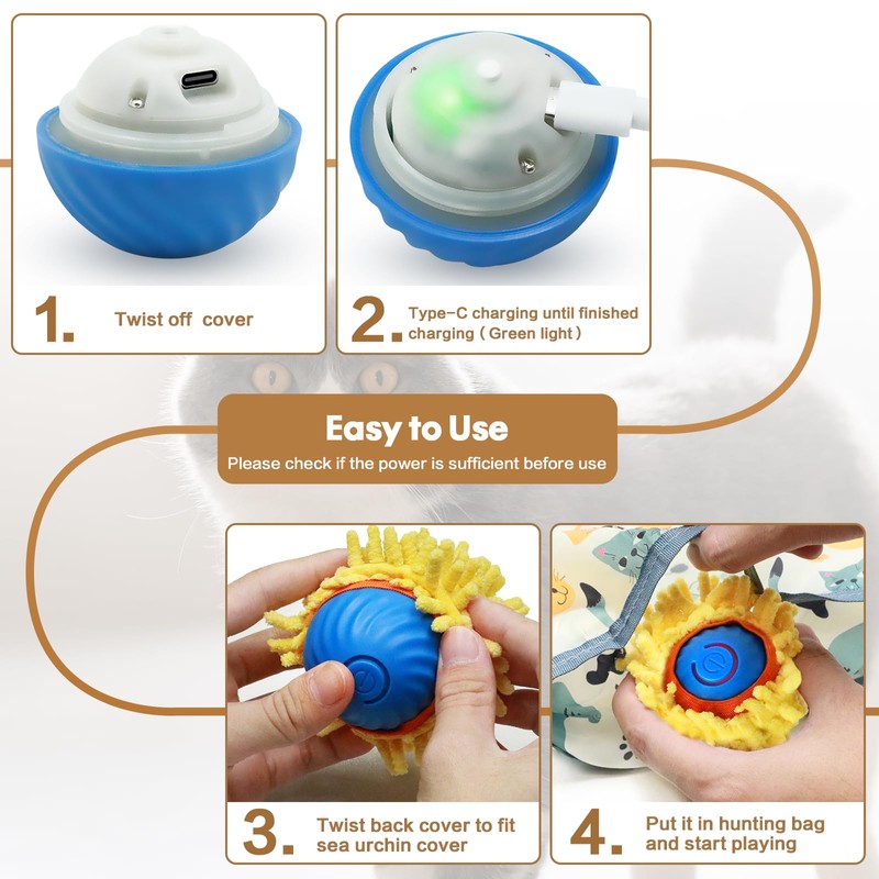 - 【Package Includes】1*Hunting Bag, 1*Sea Urchin Cover, 1*Smart Bouncing Ball and 1*Type-C Cable. Convenient for users to use, no need to frequently replace batteries. It only takes 1.5-2 hours to fully charge, and can be played continuously for 2-3 hours. (Data is for reference only)