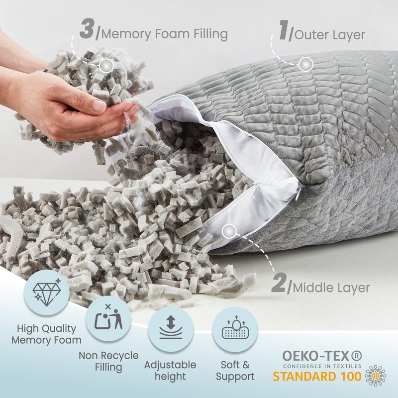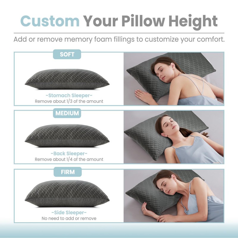 • Adjustable Pillow - Our memory foam pillow 2 pack comes with a generous amount of shredded memory foam to ensure adequate thickness. Simply remove some foam if it feels too firm or thick, and enjoy a comfortable sleep customized to suit you.