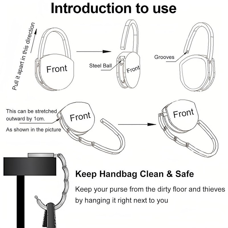 - In the restaurant, office or elsewhere, unfold the bag holder and place handbag holder on the table or bench edge to keep your bag or wallet safe.