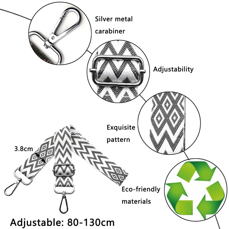 - Materials used: These bag straps are made of a high-quality, multi-processed fabric with clear print and equipped with two shiny silver clasps that allow quick change from one bag to another.