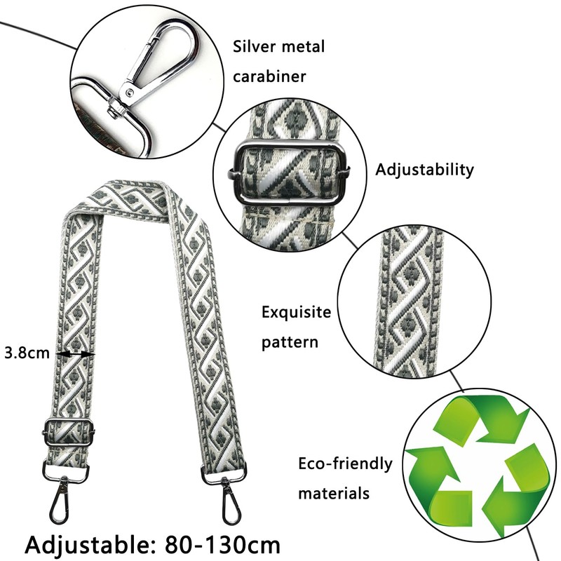 • Materials used: These bag straps are made of a high-quality, multi-processed fabric with clear print and equipped with two shiny silver clasps that allow quick change from one bag to another.