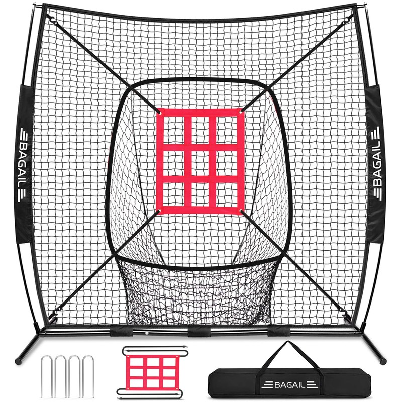 BAGAIL 7x7 ft Baseball & Softball Practice Net with Bow Frame for Batting, Hitting, Pitching, Portable Baseball Throwing Net with Strike Zone, Carry Bag, Baseball Training Aid for All Levels