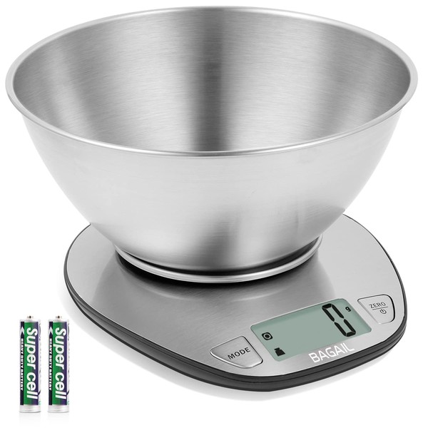 BAGAIL BASICS Electronic Kitchen Scale Premium Large Display Backing Scale Wet and Dry Food Weighing Scale with Stainless Steel Mixing Bowl - 5kg