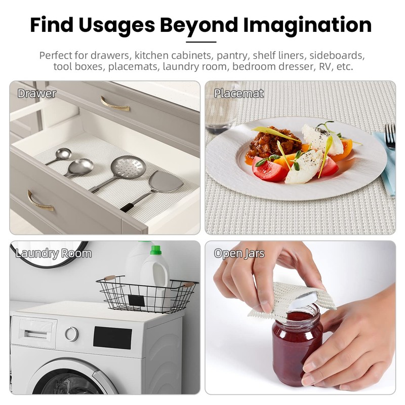 - VERSATILE USAGES - Non-slip on both sides, ideal for drawers, kitchen cabinets, pantry, shelf liners, sideboards, tool boxes, wardrobe shelves, placemats, laundry room, bedroom dresser, RV, etc. Minimize sliding, keep items in place and provide protection. Also ideal as an option for sliding sofa cushions or mattresses; craft lovers can also use it on clay and beading work. Use creativity and find more uses beyond imagination!