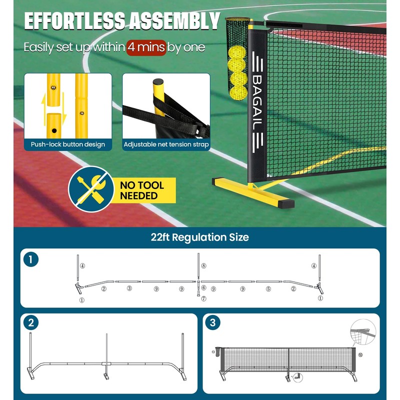 - 22FT Regulation Size: BAGAIL's latest portable pickleball net features full court size (36 "H x 22'W) that comply with USAPA regulations. You can play with family or friends anywhere - in your driveway or indoor court. Suitable for players of all ages and skill levels