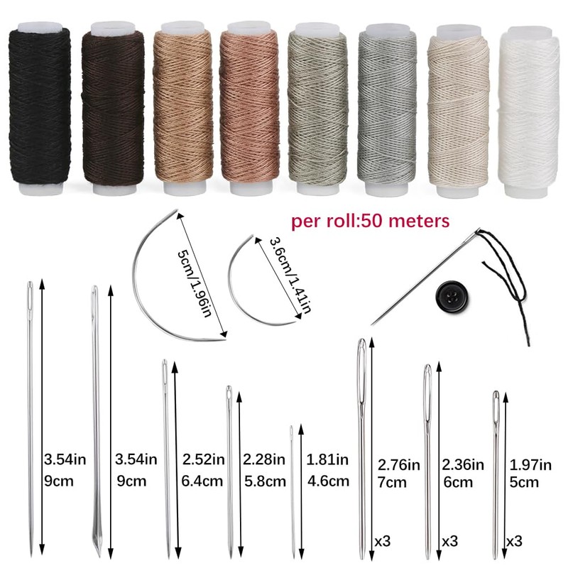 - Upholstery Repair Sewing Kit: 8 x upholstery thread cord, 7 x hand sewing needle, 9 x big eye blunt needles, 1 x sewing awl, 1 x hook awl, 1 x inch tape measure, 1 x sewing thimble, 1 x needle bottle, 1 x yarn scissors, 2 x seam rippers. Rich combinations can meet your different needs.