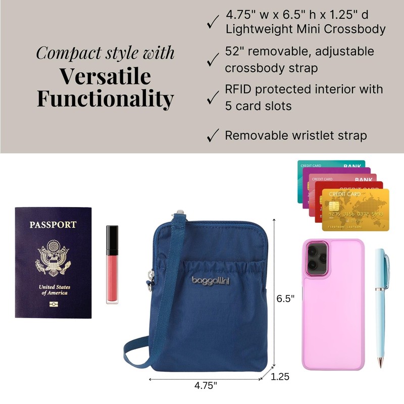 - Estilo compacto: la bolsa para smartphone Baggallini es el tamaño perfecto para llevar solo lo esencial: tu teléfono celular, tarjetas de crédito y otros artículos imprescindibles.