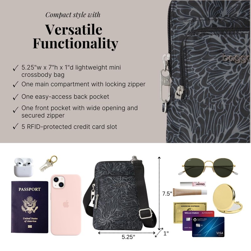 Baggallini Securtex - Bolso cruzado antirrobo para mujer, bolso pequeño con cierre de cierre, Estampado de flor de medianoche, Talla unica