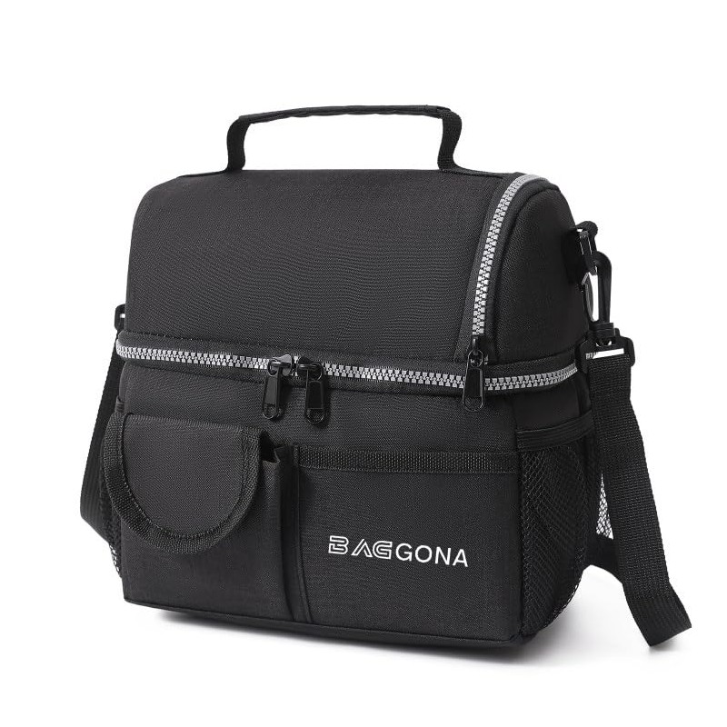 BAGGONA Insulated Lunch Bag with Compartments, lunch box for men/women, large dual compartment for adults/kids, double decker, leakproof tote, lunch cooler hot/cold, light and soft lunch box black