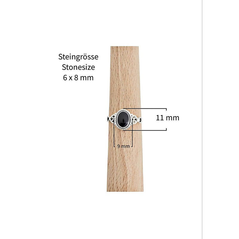 • Material: 925 sterling silver; gemstone: onyx; cabochon cut; stone size: 6 x 8 mm; colour: black; stone shape: oval; style: romantic, playful; delivered in a small cloth bag