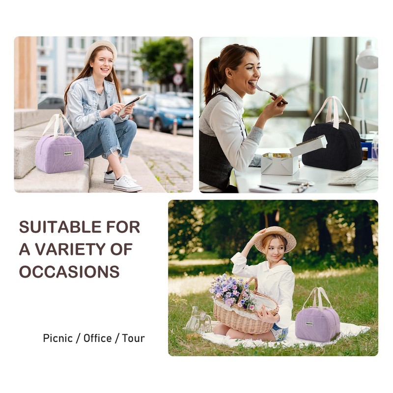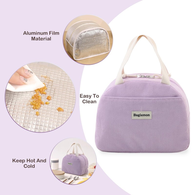 Baglemon Corduroy Lunch Bag with Cotton Webbing Handles - 6.65L Thermal Insulated Food Tote, Leakproof Reusable Meal Prep Container for Office, Picnics & Travel (Corduroy Purple)