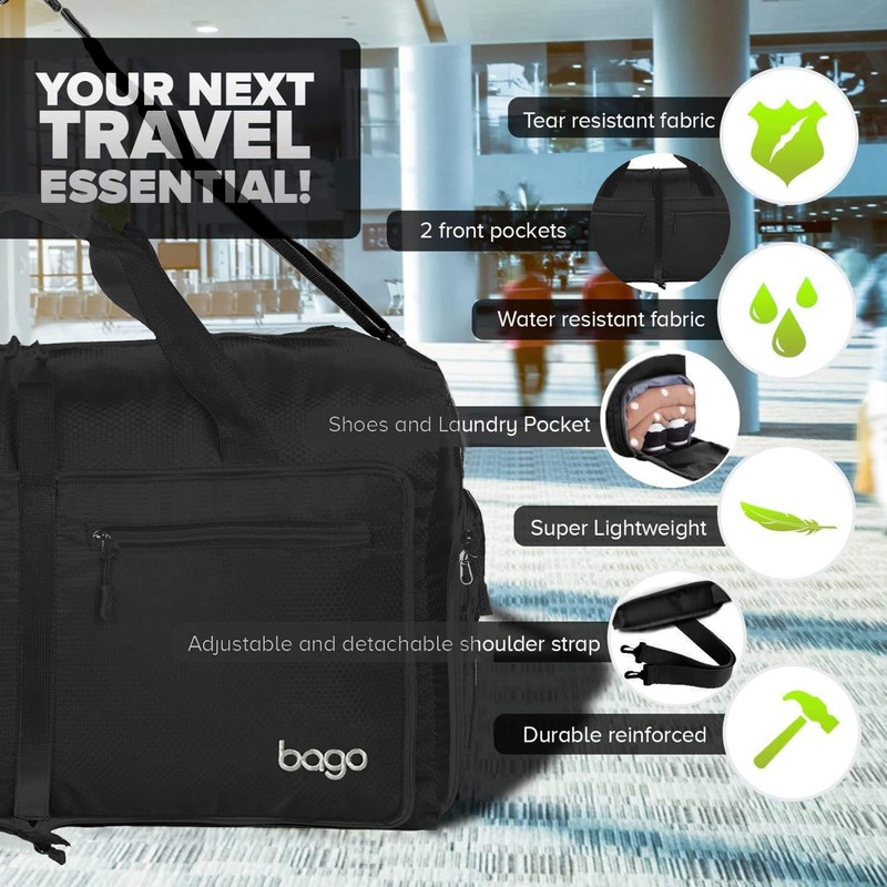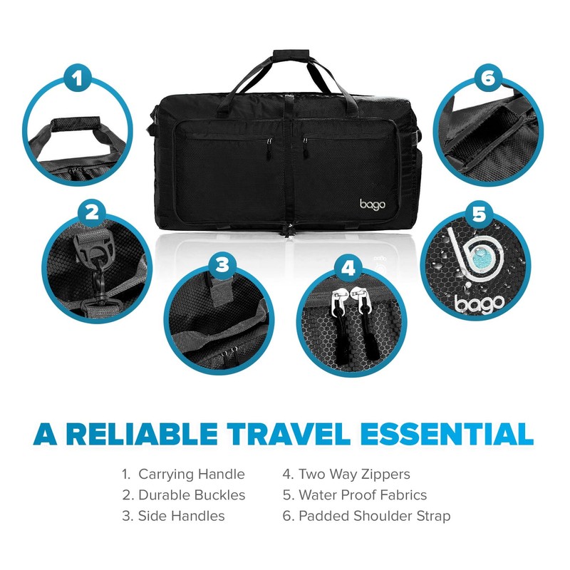 Bago Large Foldable Duffel Bags for Traveling Women & Men - 100L Packable Duffle Bag for Travel with Shoe Compartment - Water Repellant, Heavy Duty, Lightweight Folding & Collapsible (All Black)