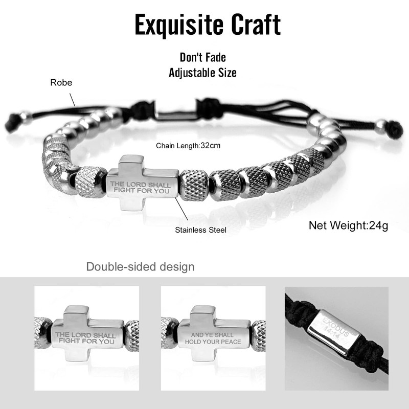 - Features a double-sided cross with an inspiring scripture "THE LORD SHALL FIGHT FOR YOU AND YE SHALL HOLD YOUR PEACE EXODUS14:14"