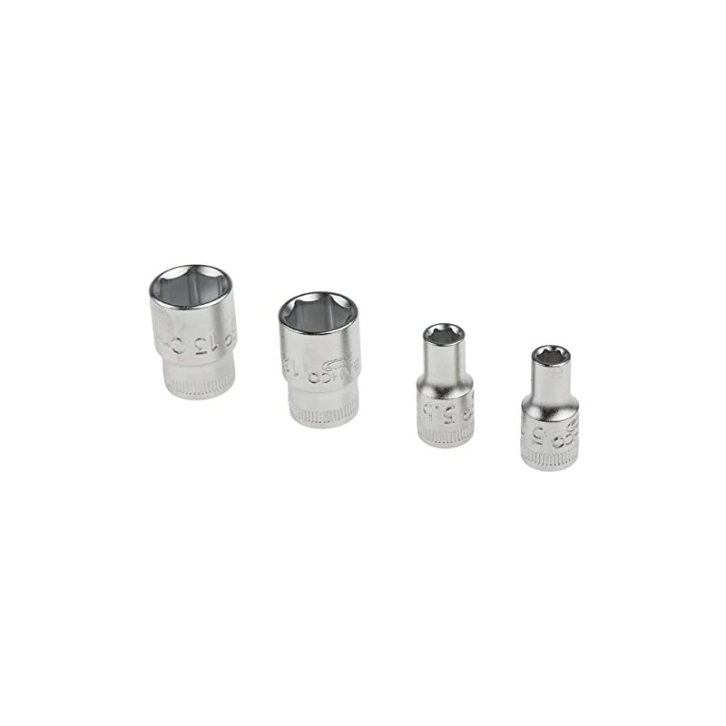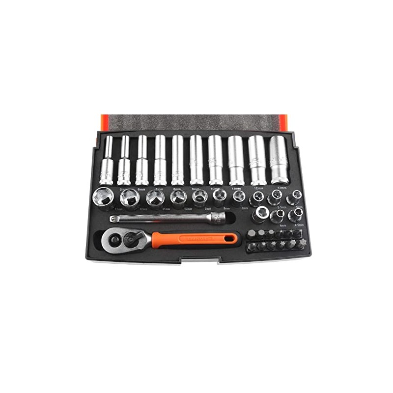 Product DescriptionA great Socket Set from Bahco with sockets ranging from 4mm to 13mm in both deep and normal depth. For a variety of applications but especially suited to hard to reach nuts and bolts in machinery. With a 100mm extension bar, a reversible ratchet with 1/4 inch drive and a bit set, this Socket Set has most of the variables covered.Box Contains12x Square Drive Sockets10x Square Drive Deep Sockets1x Pozidriv Bit2x Phillips Bits3x Hex Bits6x TORX Bits1x Bit Holder1x Ratchet1x Wobblers Extension Bar