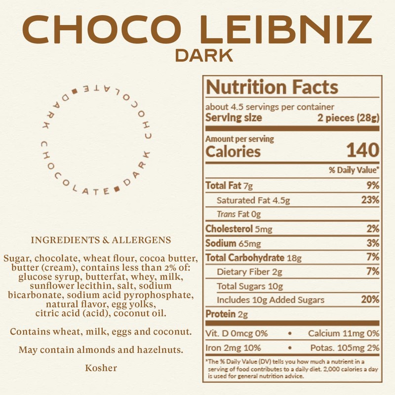 - CHOCO LEIBNIZ DARK COOKIES - A lavish layer of creamy European Dark Chocolate tops our original Leibniz Butter Biscuit. The rich, buttery cookie flavor combined with decadent dark chocolate is sure to win you over.