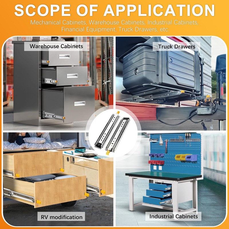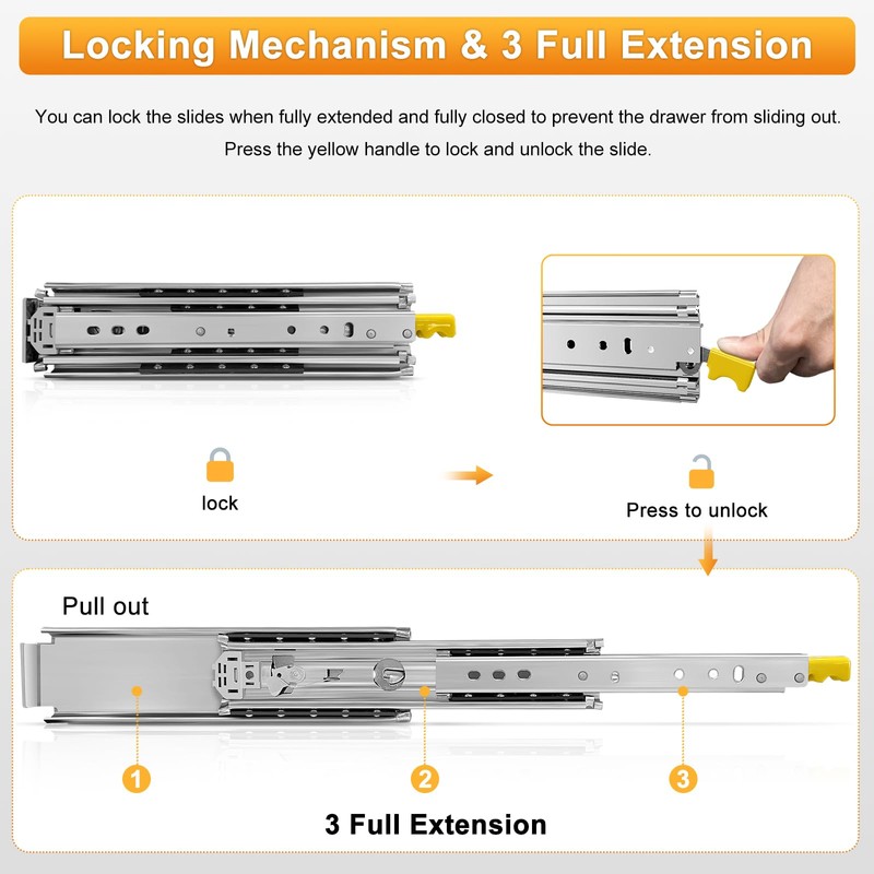 - 【Lock Drawer Slides】Press the yellow handles on both sides at the same time to lock and unlock the drawers, they can be locked when fully closed and fully opened to prevent sliding. Locking slides can be used in shelves, cabinets, industrial drawers, RVs, trucks, vending machines, etc.