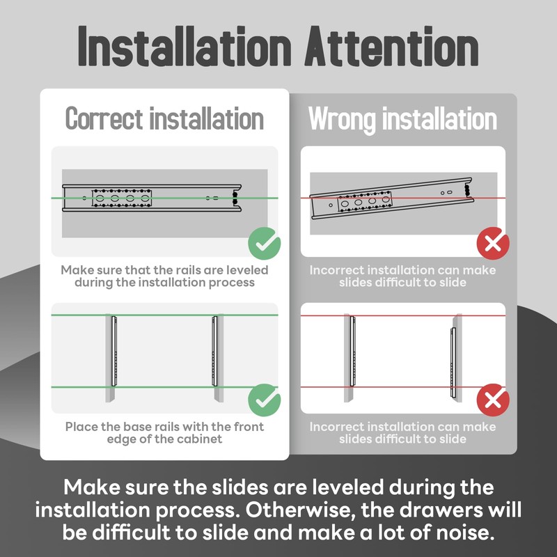 • 【What you get】You would get 1 pair of 24-inch drawer slides, mounting screws and instructions to make installation easier. Each drawer slide is individually wrapped and beautifully packaged.