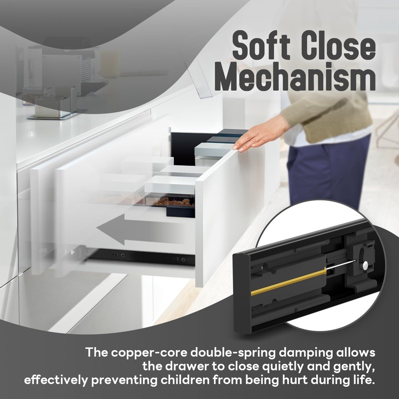 • 【Soft Close】 The self-closing drawer slide rail adopts a new copper hydraulic buffer double-spring structure, thus reducing noise when closing the drawer.For that reason,it is normal to encounter some resistance when pulling the slider apart.