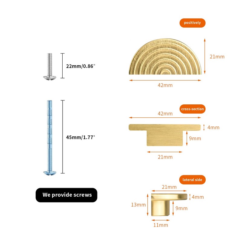 - MEASUREMENT :Total Length:1-3/4 inch(42mm) (Single Hole) Breadth:7/8 inch(21mm) Heights:1/2 inch(13mm) We will provide screws for each Kitchen handles.