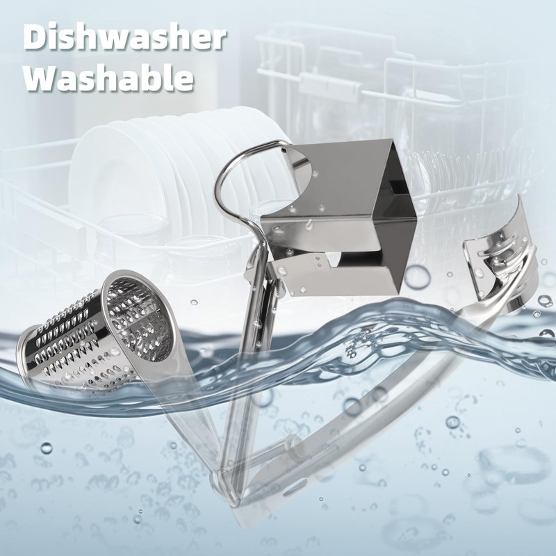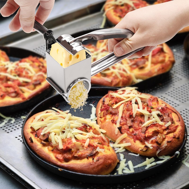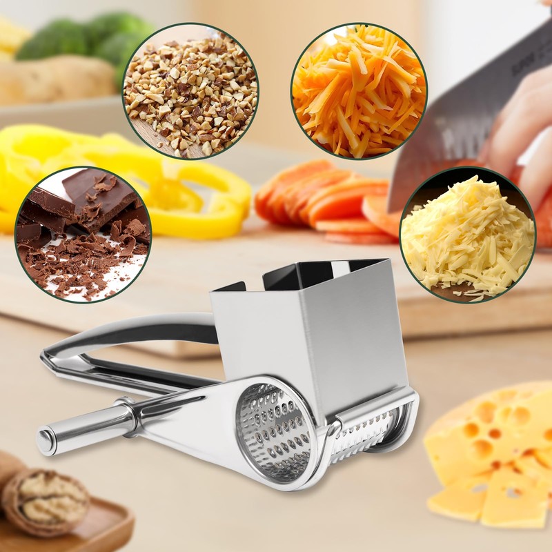 - BAKBRAND Handheld Rotary Cheese Grinder: One product includes a hand-held grinder and a stainless steel drum with 9-10 holes.