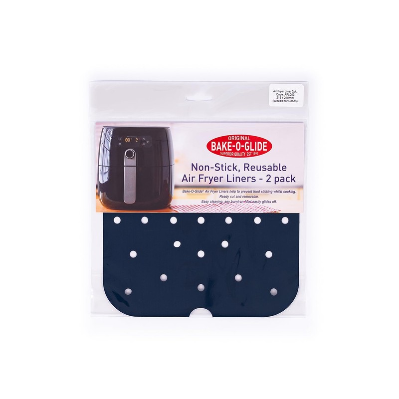 • PACK OF TWO Bake-O-Glide Air Fryer Liners. This product is suitable for the Cosori 5.5L air fryer. However, THIS PRODUCT CAN BE CUT TO SIZE TO FIT OTHER AIR FRYERS, with a sharp pair of scissors. Dimensions: 215 x 218mm. Other sizes are available.