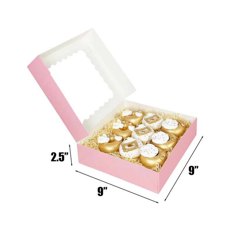 Bakepacker 36pcs Pink Pie Boxes 9x9x2.5 inches Easy Assemble Macaroon Cookie Boxes Bakery Boxes with Window for Bakery (Auto-pop Up)
