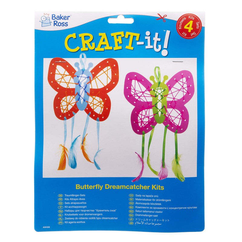 Baker Ross AW406 Butterfly Dreamcatcher Kit (Pack of 4) Make Your Own Using Dream Catcher Supplies - with Template, Wool, Feathers, Ribbon and Needle