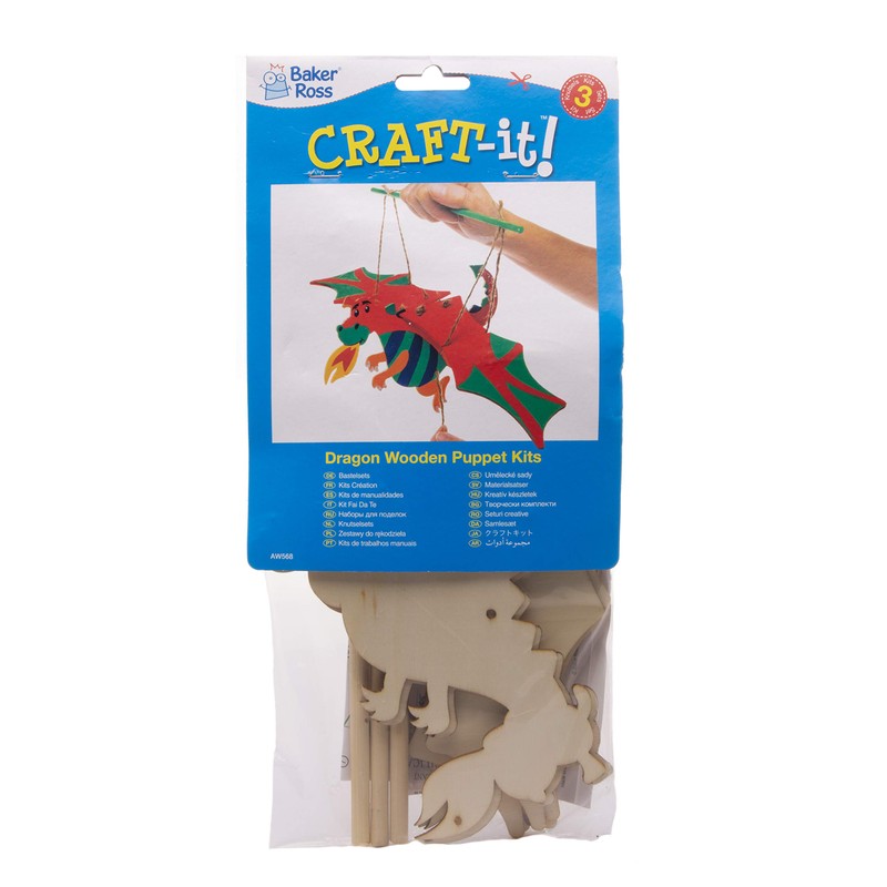 Baker Ross AW568 Dragon Wood Craft Puppets (Pack of 3) Moving Puppet with Movable Wings, Arms & Legs for Kids To Create, Assorted
