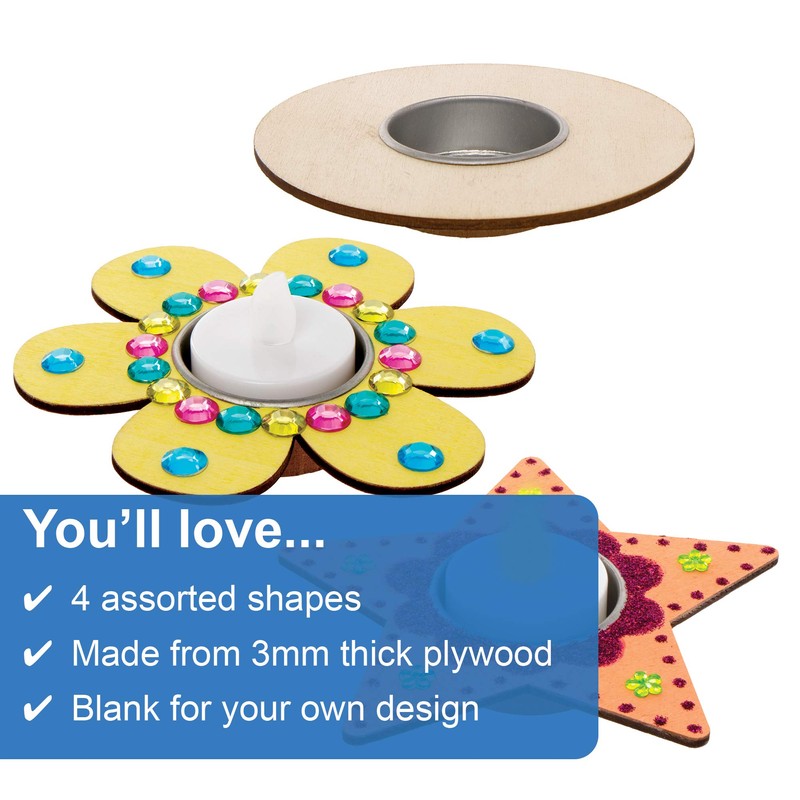 - Included in the Pack: Shaped wooden tealight holders to decorate with our Deco paint pens or acrylic paints. Perfect for use with our LED Tealights (not included). 4 shapes. Diameter 10.5 - 12 cm (4.1 - 4.7 inch).