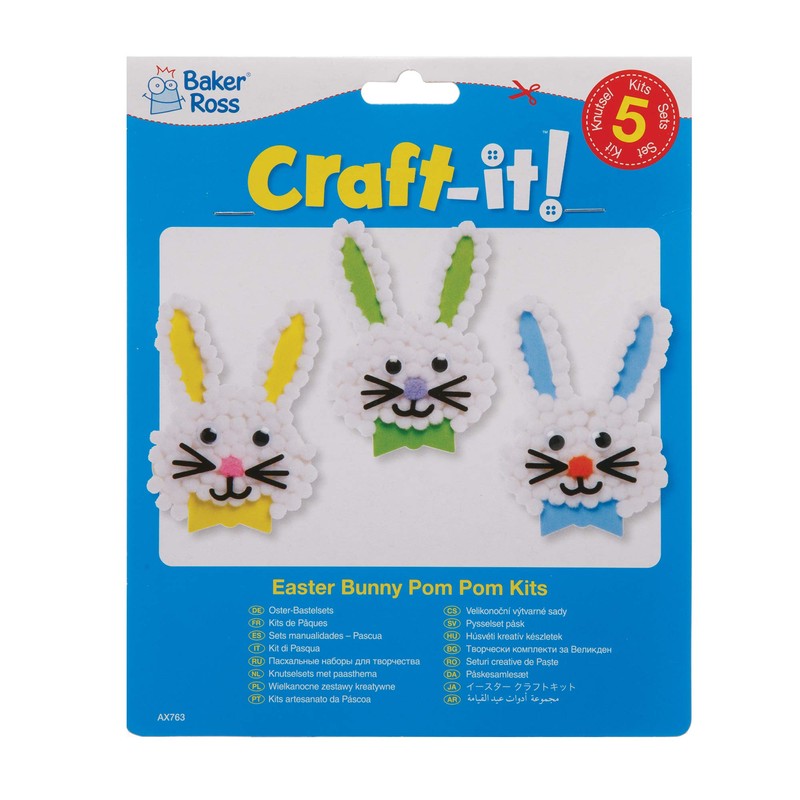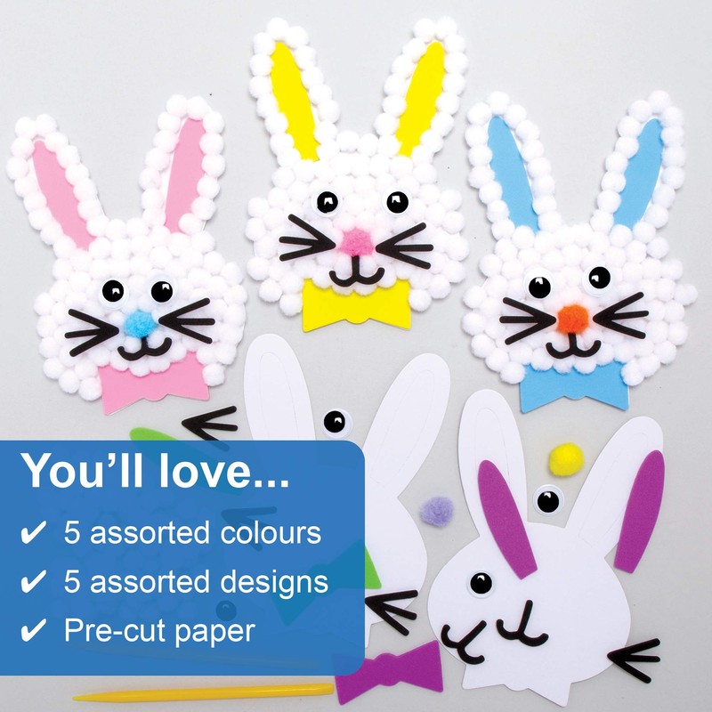 - PACKAGE INCLUDES Each pack contains a pre-cut Easter bunny stencil made of self-adhesive cardboard, self-adhesive foam pieces, wiggly eyes and pom poms. 5 assorted colours - Purple, Yellow, Green, Pink and Blue. 5 assorted designs. Size: 15.5 x 10 cm. Peel off the pre-cut pieces to get a sticky surface, and then add the colourful pom poms. Includes instructions (English language not guaranteed). English language not guaranteed). Glue may be required (not included).