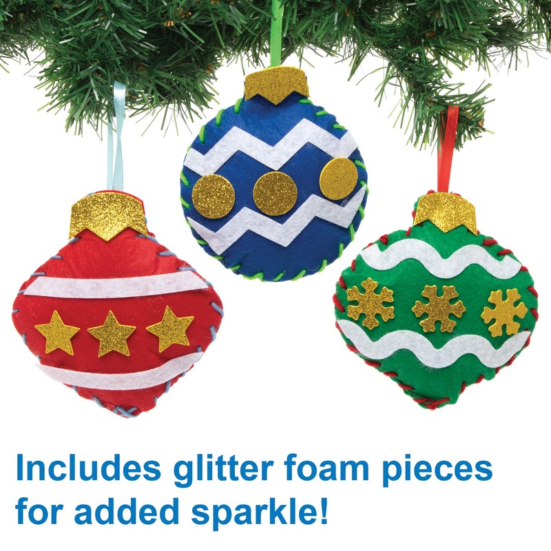 - Included in this Pack: Each pack contains 3 bauble colours - Red, Blue & Green and 3 designs. Includes glitter foam pieces for added sparkle! Each kit contains pre-cut felt templates, felt & foam shapes, wool, plastic needle, stuffing and ribbon for hanging. Instructions included. Glue required. Width 11cm -12cm (4.3 - 4.7 inch).