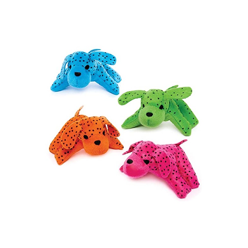 • Package includes: 4 x dog plush toys. Comes in 4 assorted rainbow colours. Size 10 cm