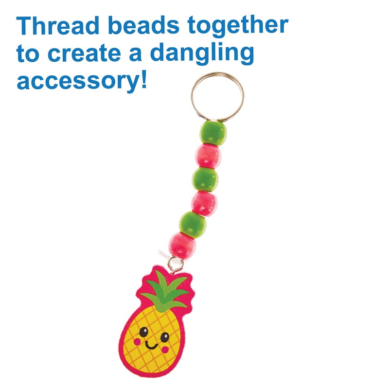 - Included in the Pack: This pack contains 4 kits, each kit contains wooden pendant, coloured beads, white cord and metal split ring, in 4 Summertime designs - Roller Skate, Ice Cream, Pineapple & Sun. 4 assorted bead colours - Pink, Yellow, Green & Orange. Finished size approx. 12cm. Instructions included. No glue required Age 5+