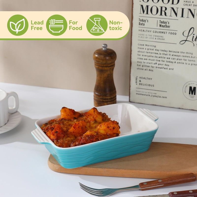 - Elegant Wave Pattern and Smooth Surface--The unique wave pattern design of the baking pans combines beauty with utility. Available in white, red, and turquoise, no matter whether your kitchen decoration style is simple and modern or warm and pastoral, these baking dishes add a splash of color to your kitchen. The bakeware sets surface and bottom are smooth glaze, non-stick porcelain, not only easy to clean but also providing a comfortable use experience.