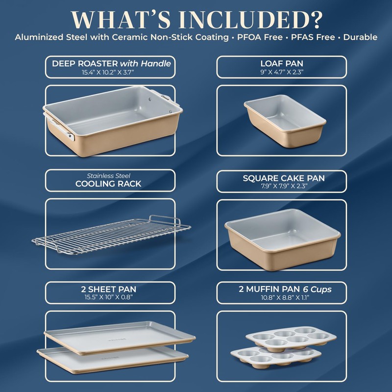 - Complete Baking Solution: The set features a stainless steel cooling rack, sheet pans, a muffin pan, a loaf pan, a square cake pan, and a deep roaster with a handle, offering everything you need for diverse baking tasks.