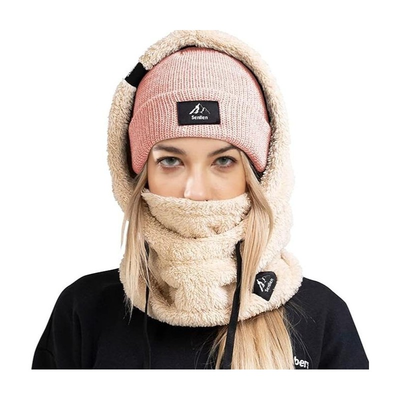 Balaclava Cold Weather Fleece Windproof Ski Mask Winter Breathable Thermal Face Mask Neck Warmer Scarf Helmet Hood Sherpa Hood Fleece Hood height 21.3 inch width 13 inch - Color: Beige