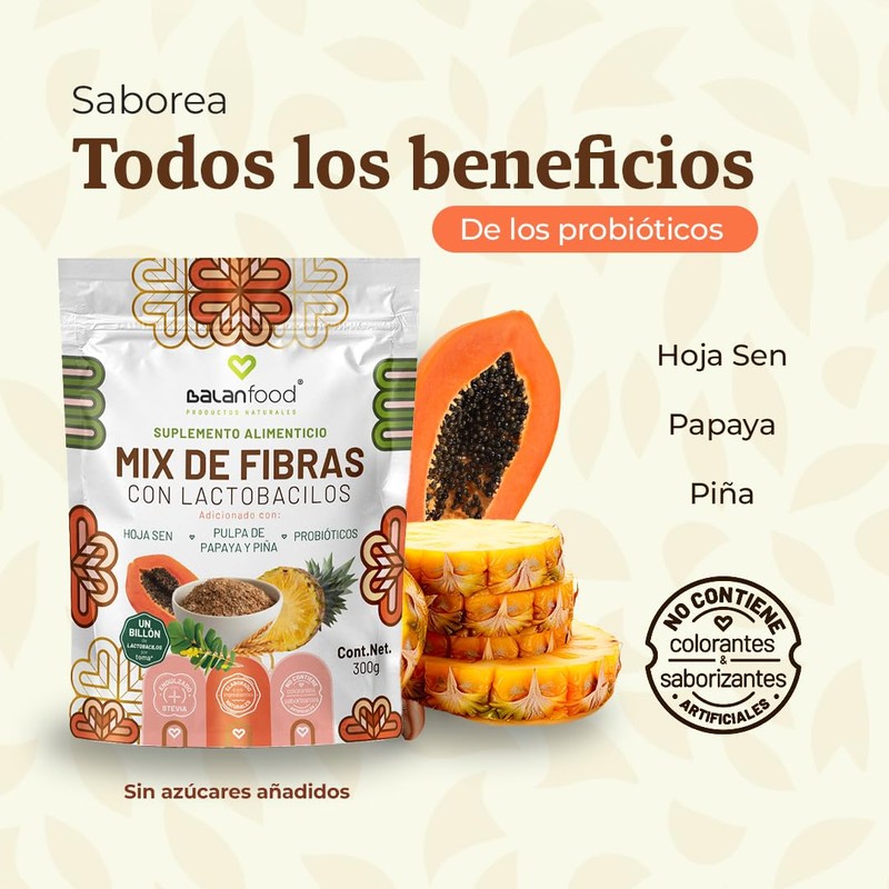 BALANFOOD Mix de Fibras con lactobacilos | Mix de Fibras en Polvo 300g con Lactobacilos, Probioticos, Hoja de Sen, Pulpa de Papaya y Piña | Suplemento Alimenticio | 100% Natural Sin Aditivos Sin Conservantes