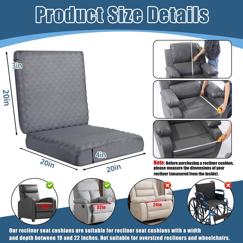 - 【Fit Size】:Recliner support cushion measures 20 x 20 x 3 inches, thick seat cushion is 20 x 20 x 4 inches, perfect fit for your recliner, for you to find the balance of support and comfort, can be suitable for wheelchairs, office chairs or recliners, help to reduce back pain, hip discomfort