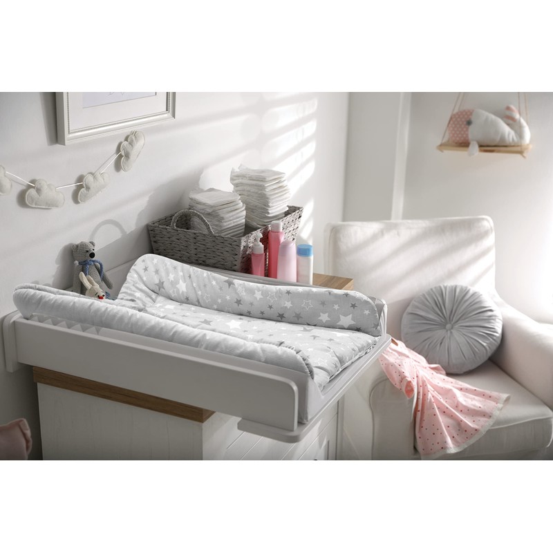 - Einfach anzubringen: Die Frottee-Unterlage kommt mit einer wasserabweisenden Beschichtung auf der Unterseite. Sie wird an der Wickelkommode aus Baumwolle mit weichen Klettverschlüssen befestigt