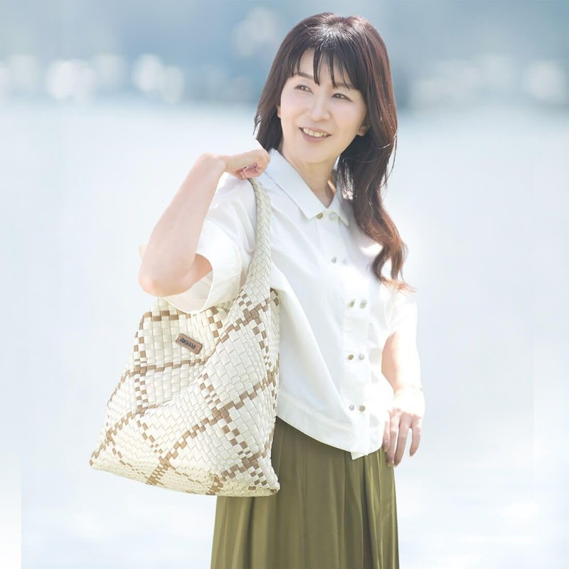 Bi-color mesh tote bag made of 2-color material. The elastic material used in wetsuits are woven into a mesh shape. The magnetic closure allows you to easily insert and remove your belongings, so you can store plenty of items you need. The included pouch is also made of the same material as the main body of the bag, and it has a zipper closure, making it convenient for storing small items and valuables. This bag will make your outfit look gorgeous.