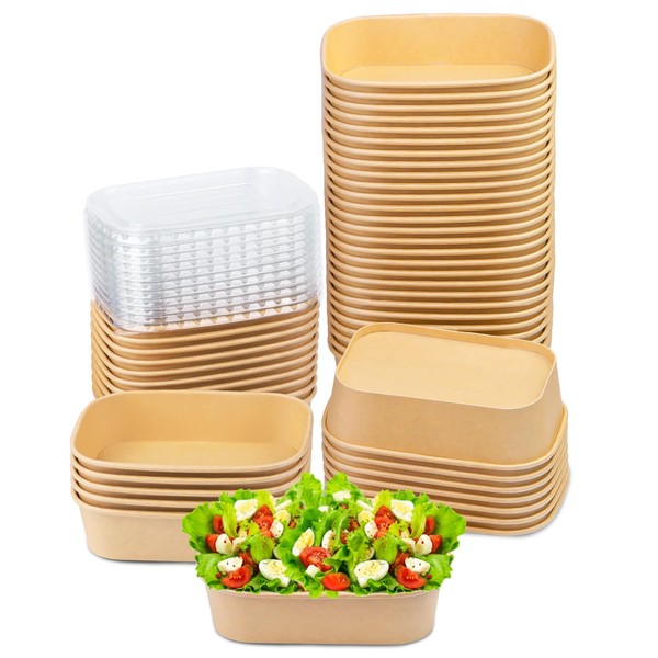 BALDCC 19 oz 50 Pcs Paper Bowls with Lids, Disposable Salad Bowls with Lids,Paper Food Containers, Disposable Square Kraft Paper Bowls with Lids for Salad, Soup, Snacks, Desserts