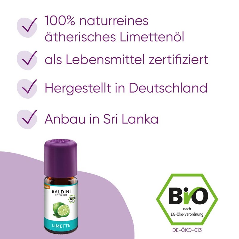 - Highest-quality: Baldini by Taoasis organic lime oil is a 100% natural aroma made from pure essential oil from citrus aurantifolia. The oil is demeter certified and conforms to the highest food standard.