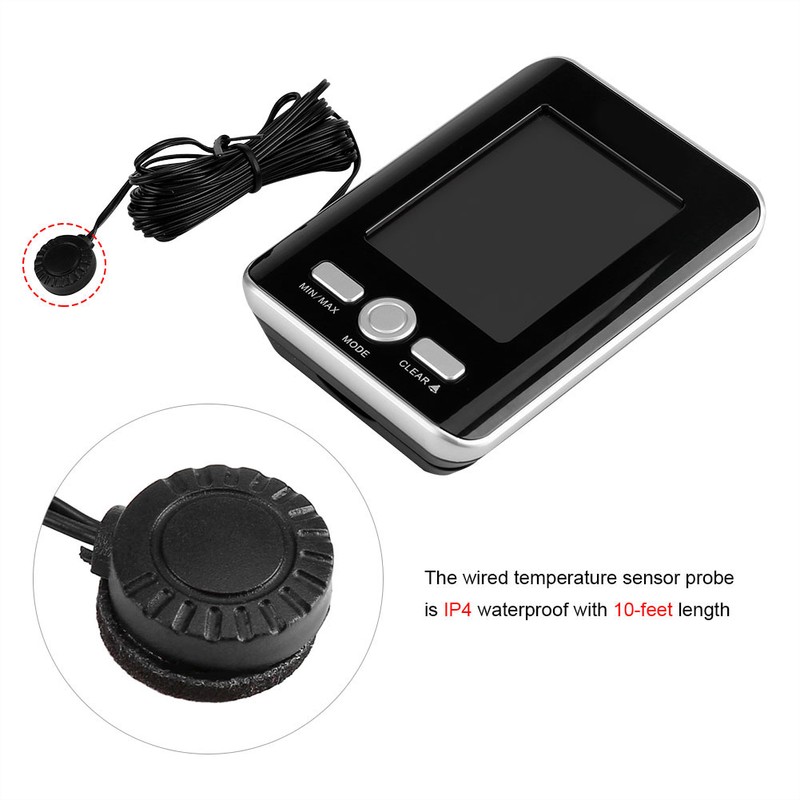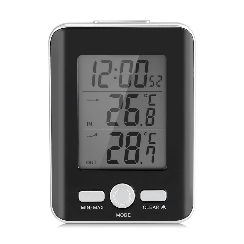 This is a digital thermometer clock with wired temperature sensor. It features precise and reliable indoor/outdoor temperature readings wired probe. The thermometer provides the indoor temperature and the wired sensor detecting outdoor temperature. The large and easy to read LCD screen displays the current time, temperature, trend, and MAX/MIN records. The wired temperature sensor probe is 10-feet long for easy positioning outside a window, door or inside a cage or other areas.