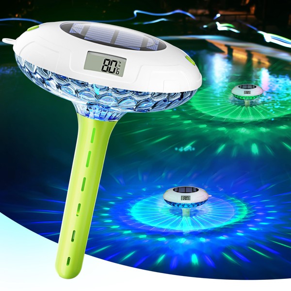 BALDR Pool Thermometer Floating Easy Read, Solar Ponds Thermomter with 8 RGBW Color Modes, Dual Digital Displays & IPX7 Waterproof for Ponds Water Gardens & Inground Above Ground Pools (Green)
