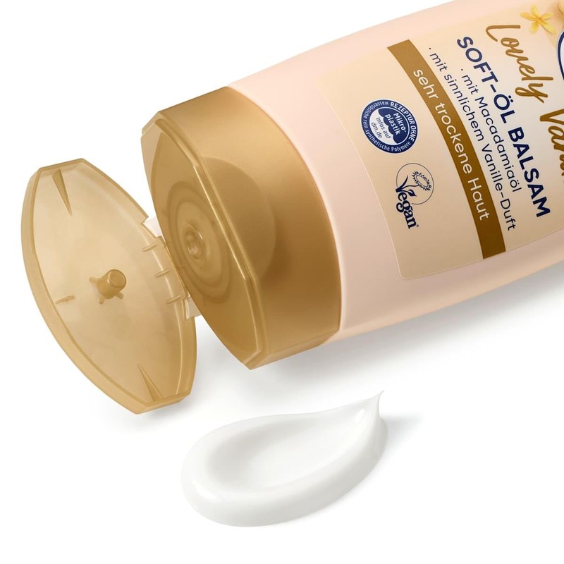 - Balea Soft-Öl Balsam Lovely Vanilla, 200 ml: Formel mit Sonnenblumen- und Macadamianussöl. Beruhigt die Haut mit Vitamin E. Mit sinnlichem Vanille-Duft. Hautverträglichkeit dermatologisch bestätigt. Vegan. Ohne Paraffine / Mineralöle. Ohne Parabene. Ohne Aluminiumsalze. Ohne Farbstoffe. Ohne Nanopartikel.