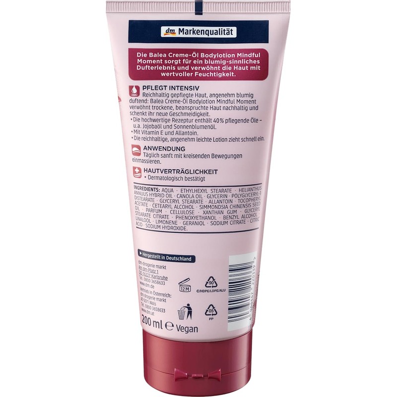- Körperlotion Creme-Öl Mindful Moment: Pflegende Bodylotion. Mit blumigen Duft. 40 % Öl-Anteil. Rezeptur ohne Mikroplastik & wasserlösliche rein synthetische Polymere. Inhaltsstoffe zu 98 % biologisch abbaubar (inkl. Wasser). Flasche aus 100 % Recycling-Material. Hauttyp: Normal. Anwendungsbereich: Körper. Produkteigenschaften: ohne Alkohol, ohne Farbstoffe, ohne Nanopartikel, ohne Parabene, ohne Paraffine / Mineralöle, pH-Hautneutral, vegan. Textur: Gel.