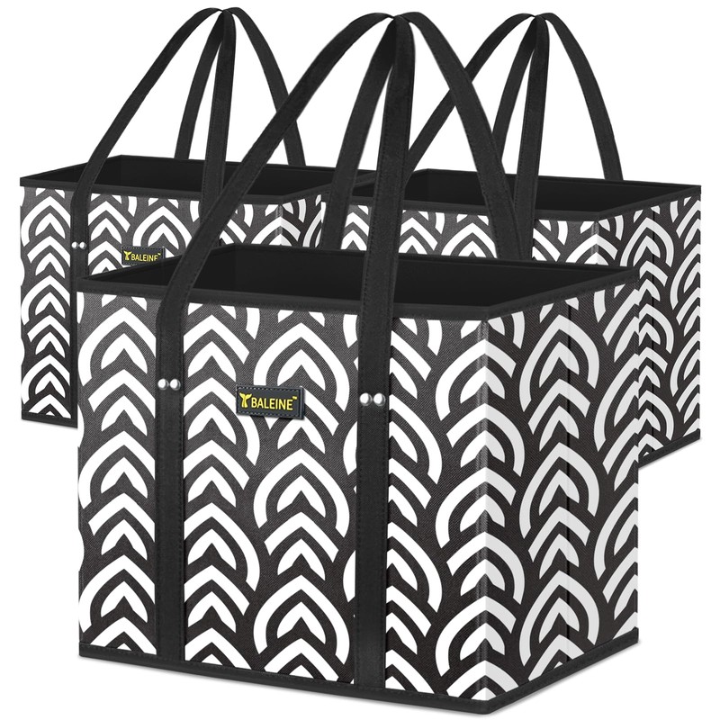 - EXTRA LARGE & STURDY: Spacious box shaped bags provide ample shopping space. Rigid design with reinforced bottom keeps the reusable grocery bags up for easy loading and unloading. Strong and extra-long (12'') handles fit tall items and allow shoulder carrying.