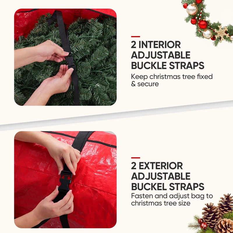 - [HEAVY-DUTY] Made from durable, tear-resistant PE weaving materials, this Christmas tree storage is built to last. The inside fixed buckles are designed to fix the tree and reinforced handles ensure it supports heavier loads securely. . This bag effectively protects your holiday decorations from dust, moisture, and small animals.